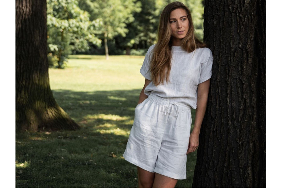 Klasický ľanový top a šortky z prémiového 100 % ľanu splynuli s prostredím tak prirodzene, akoby tam patrili odjakživa. V odtieňoch machovej zelene Moss green a perlovej sivej Pearl gray vznikli dve variácie letného kompletu, ktoré ukazujú, že prírodná elegancia môže byť jemná aj výrazná zároveň.