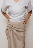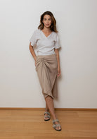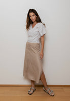 Náš tip na kombinovanie: Vďaka neutrálnemu odtieňu ľahko skombinujete sukňu s ľanovými topmi v akejkoľvek farbe alebo s bavlneným tričkom pre ležérnejší vzhľad.