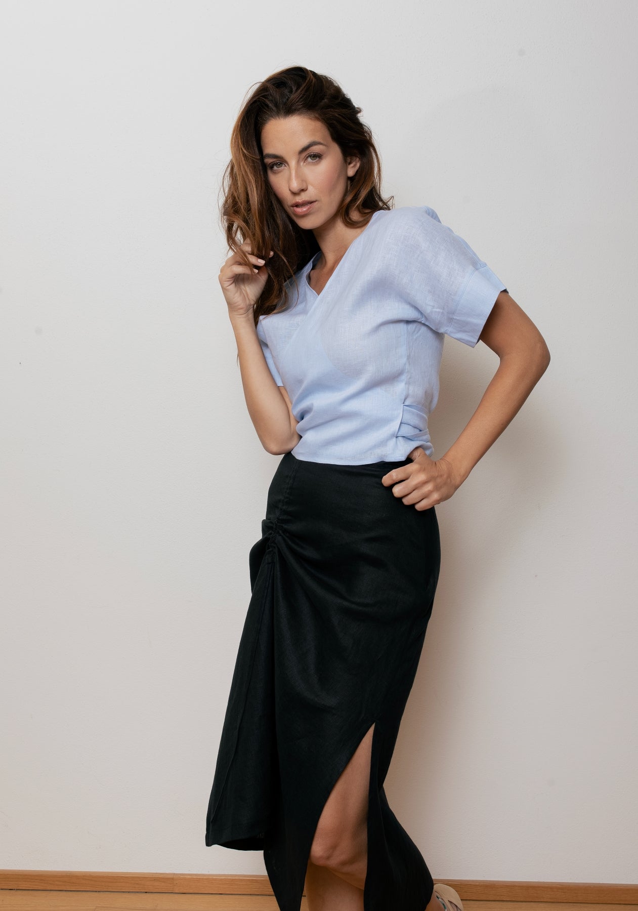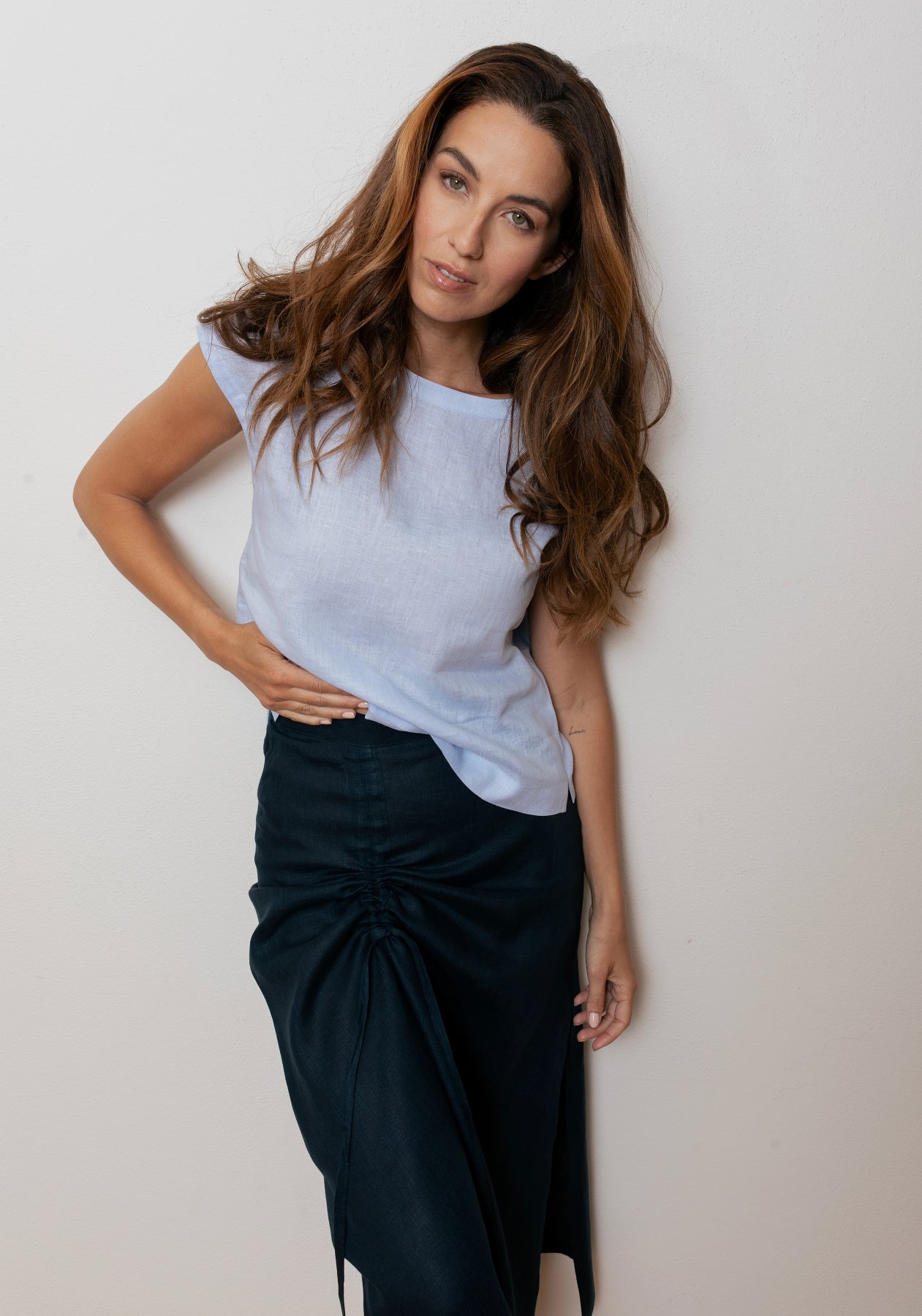Ľanová sukňa s bočným rozparkom a nastaviteľným viazaním v páse je ideálnou voľbou pre pohodlný a zároveň elegantný vzhľad. Vďaka zmäkčenej úprave látky je veľmi príjemná na tele a vhodná na každodenné nosenie počas teplých dní. Sukňa má pohodlný strih, čiastočne elastický pás a skrytý bočný zips.