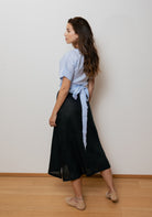 Tento ľanový zavinovací top je vyrobený zo 100 % prírodného ľanu so zmäkčujúcou úpravou, vďaka čomu je mimoriadne príjemný na dotyk a pohodlný na nosenie. Variabilné zaväzovanie umožňuje prispôsobenie veľkosti – pohodlne sedí na dve konfekčné veľkosti. Nosiť ho môžete samostatne k nohaviciam, šortkám alebo sukni – ak si zvolíte sukňu v rovnakom odtieni, pôsobí ako šaty. Rovnako dobre sa nosí ako štýlový doplnok na tričko, top alebo šaty.