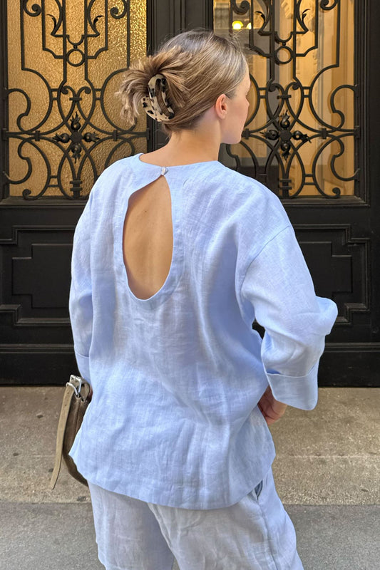 Outfit by Maria Hason | All Linen Pearl Gray Pants & Open back top