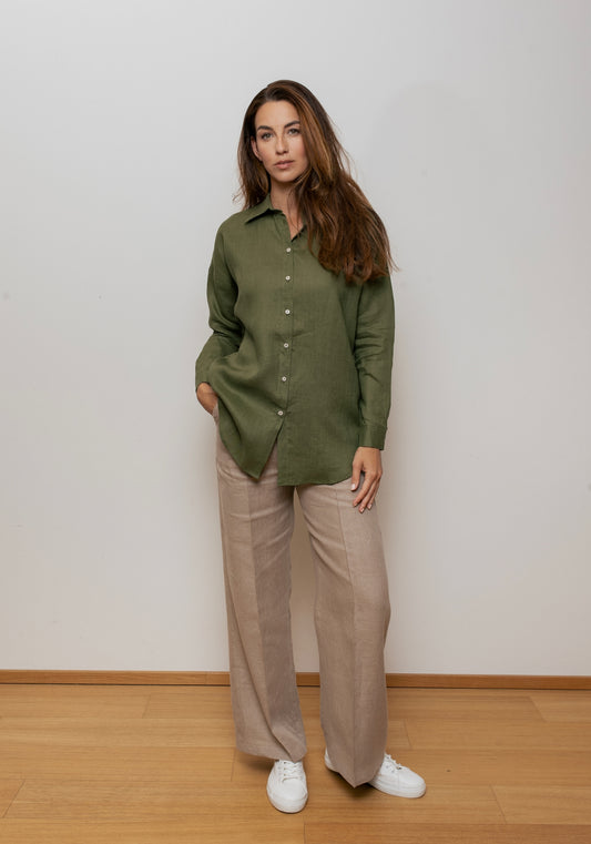 Dámská lněná košile s límečkem loose fit - Moss green