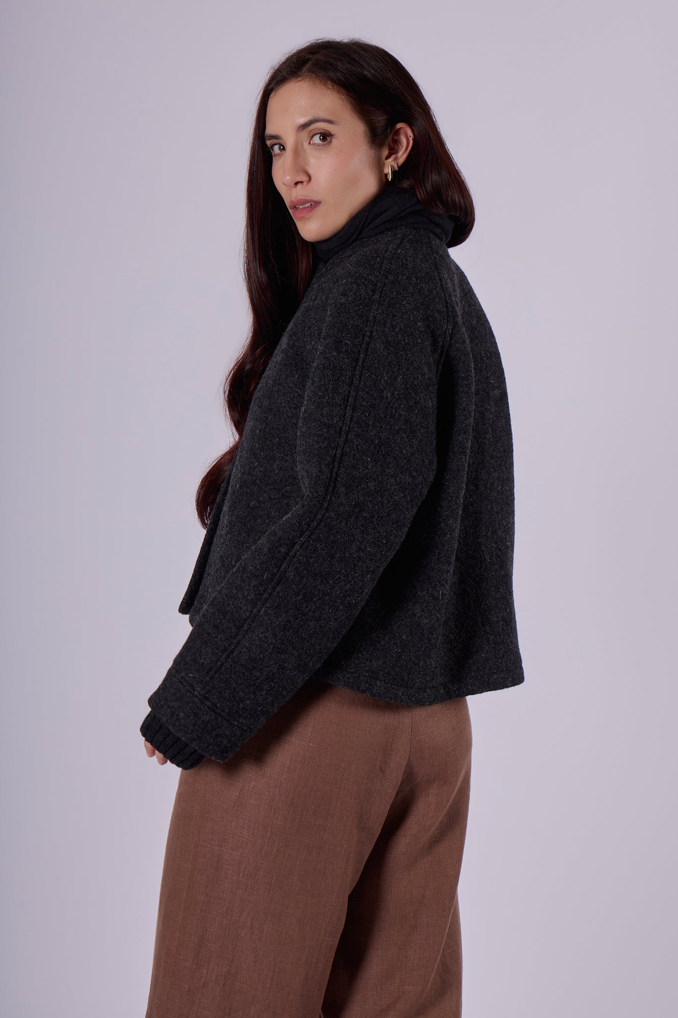Elegantní krátký dámský kabát ze 100% prémiové vlny, která je lehká na nošení, ale zároveň spolehlivě zahřeje i během chladnějších dnů. Materiál je jemný, odolný a vysoce kvalitní, díky čemuž se kabát stane nadčasovým kouskem, který vám bude sloužit dlouhé roky.