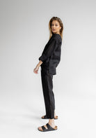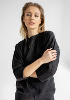 Women`s linen top with open back and three-quarter sleeves. Incredibly pleasant on the body thanks to the softening finishing of the fabric. Sustainably and precisely made in EU. The fabric softens considerably after washing.