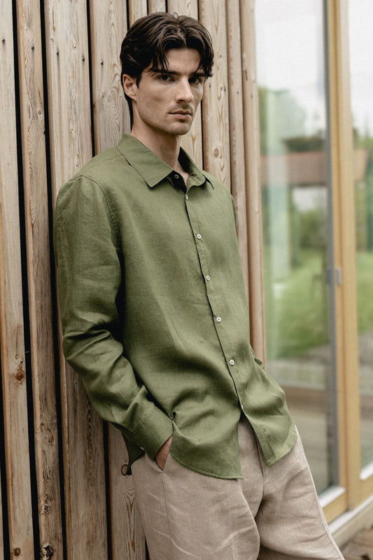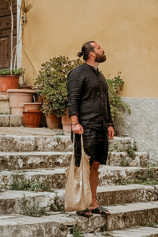 Outfit by Tomáš | Linen shirt Moss green & Shorts Black