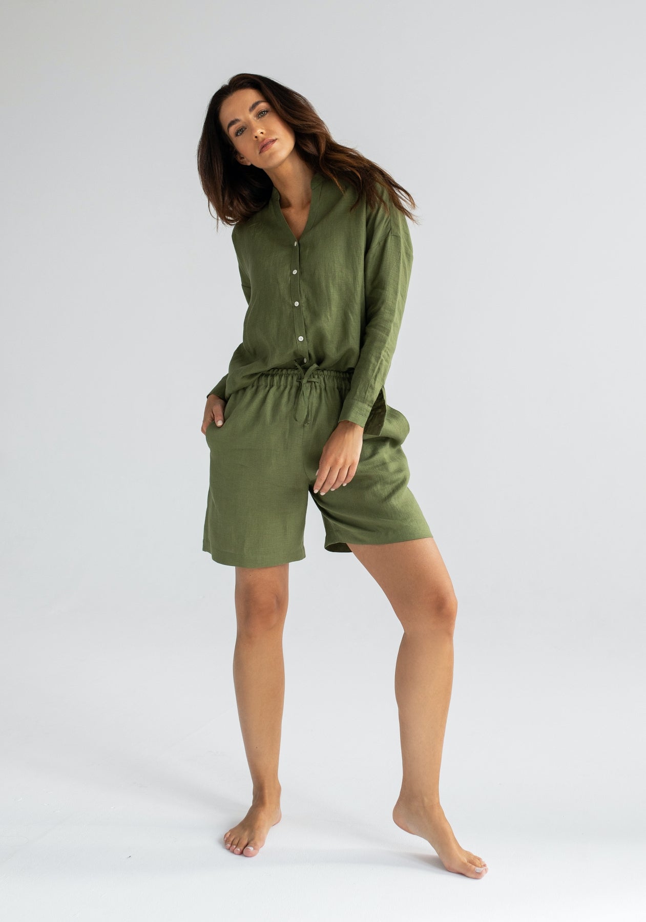 Women's linen shorts. Incredibly pleasant on the body thanks to the softening finishing of the fabric. The size is rather large - loose fit. Sustainably and precisely made in EU. The fabric softens considerably after washing.