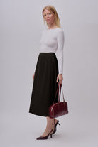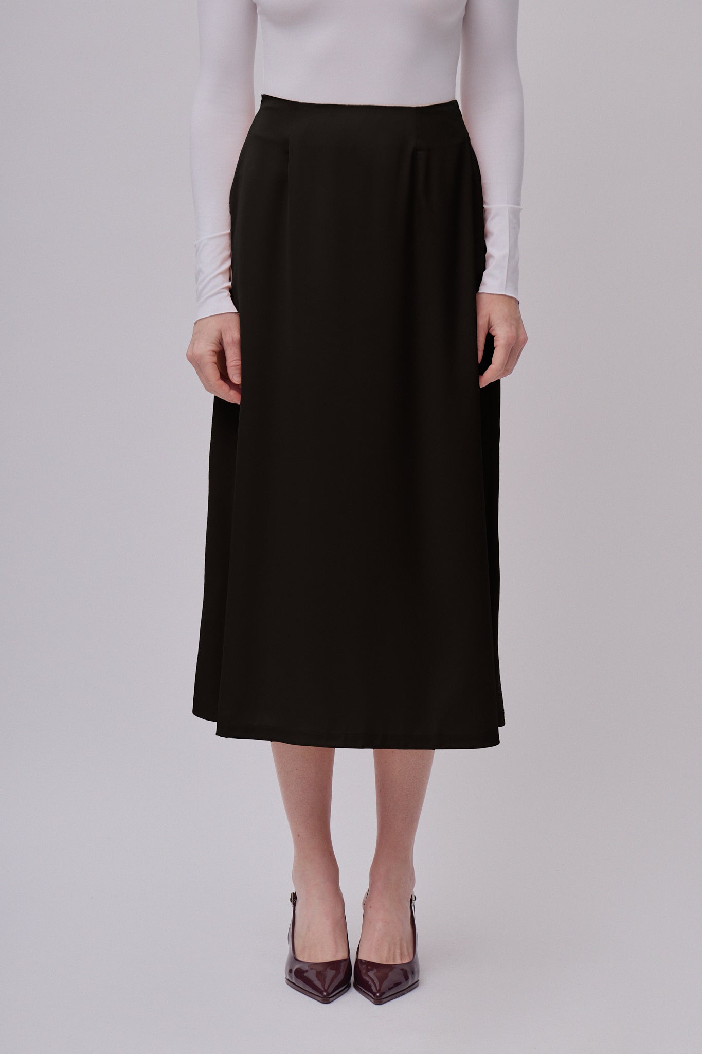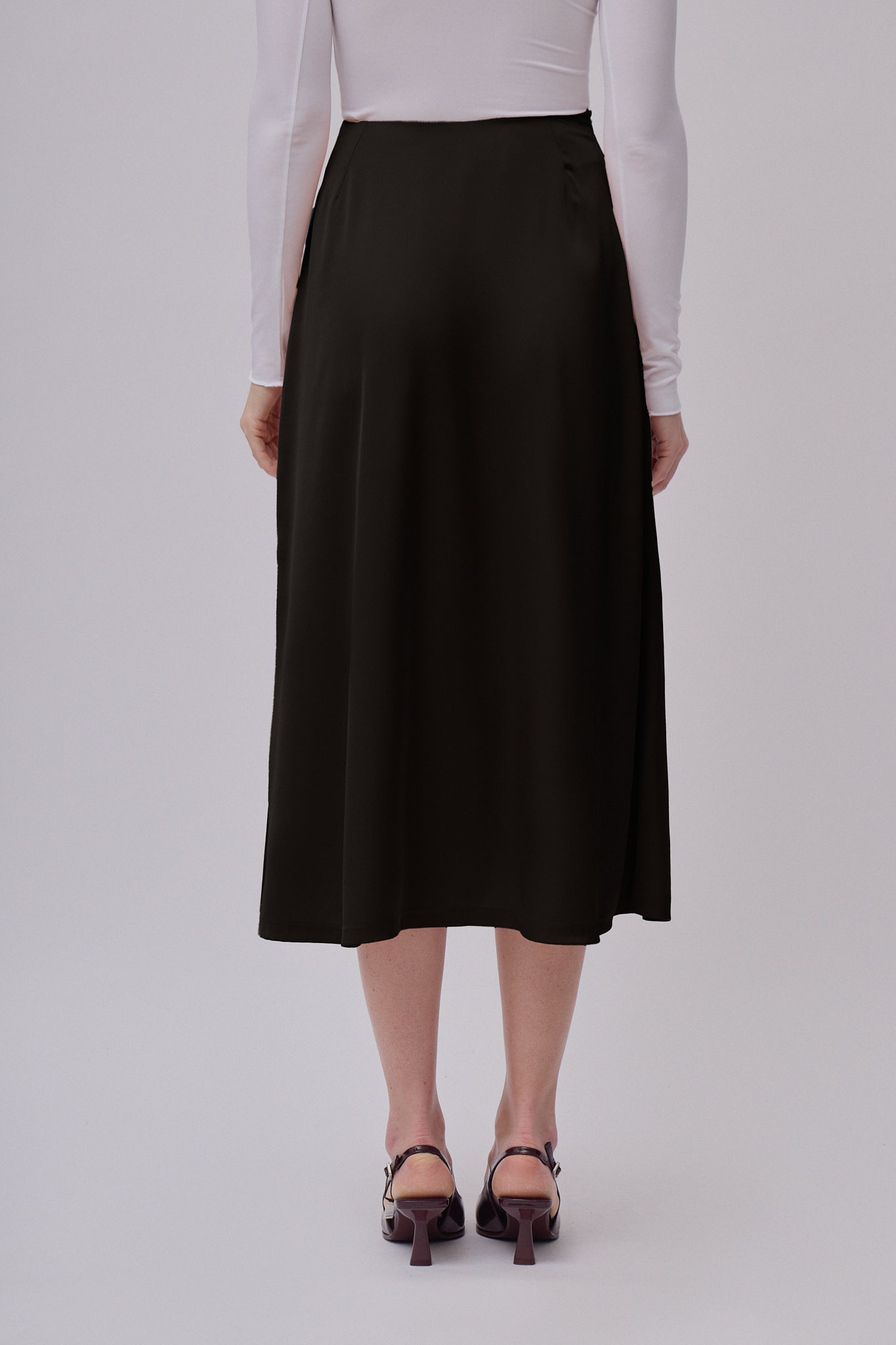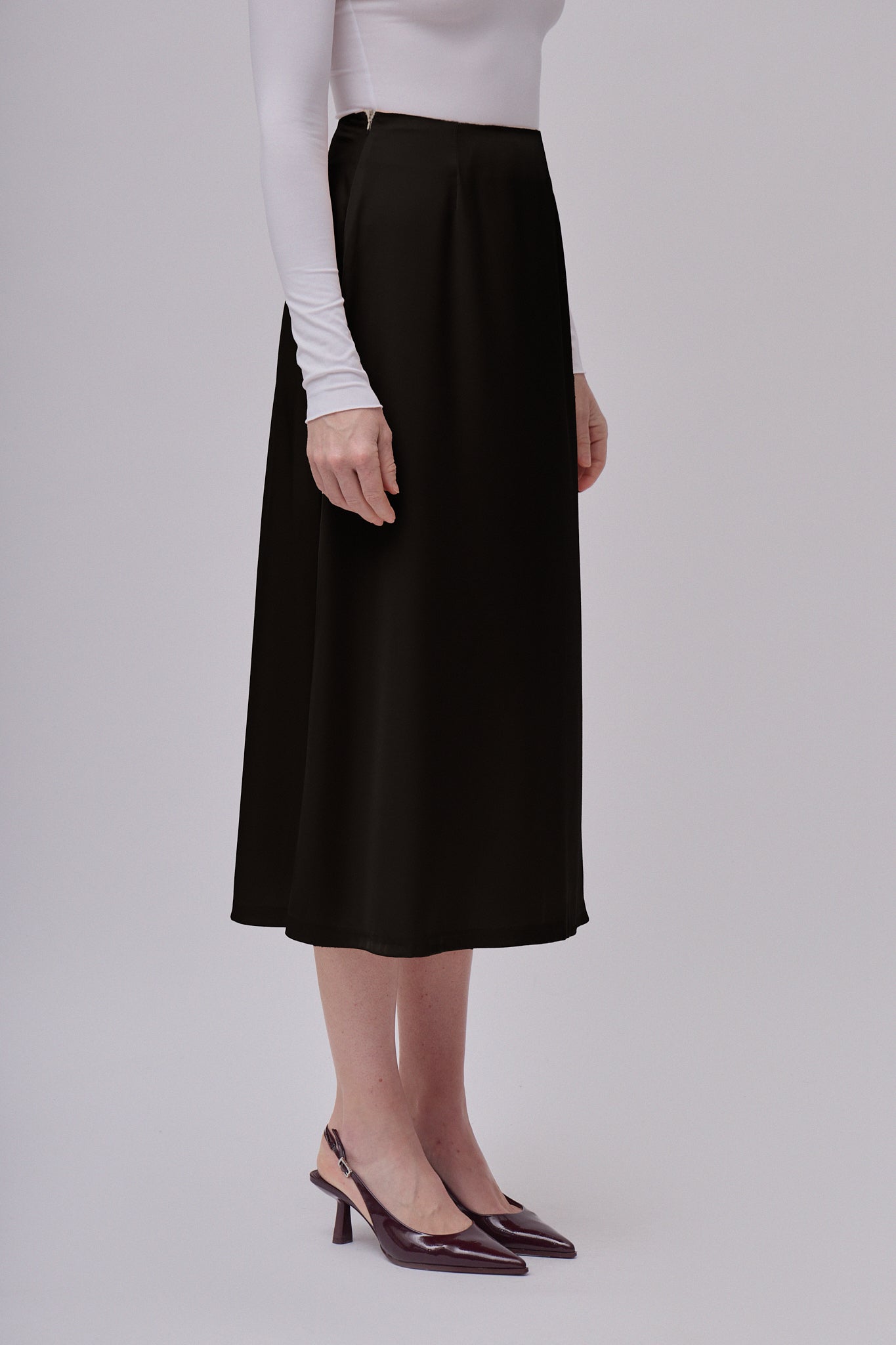 Lekki, lejący materiał nadaje spódnicy naturalny połysk i luksusowy wygląd, jednocześnie zapewniając komfort noszenia przez cały dzień. Ukryty zamek błyskawiczny podkreśla czysty i elegancki design.