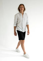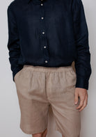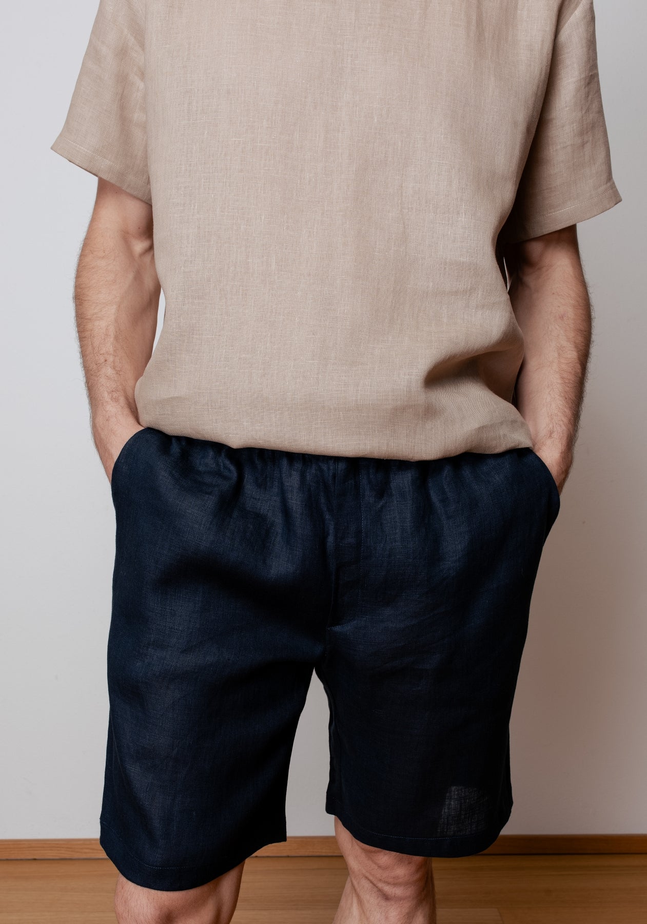 Męskie lniane spodenki, niezwykle wygodne dla ciała dzięki zmiękczającej obróbce tkaniny. Wyprodukowano precyzyjnie i w sposób zrównoważony w UE. Tkanina po praniu znacznie mięknie.