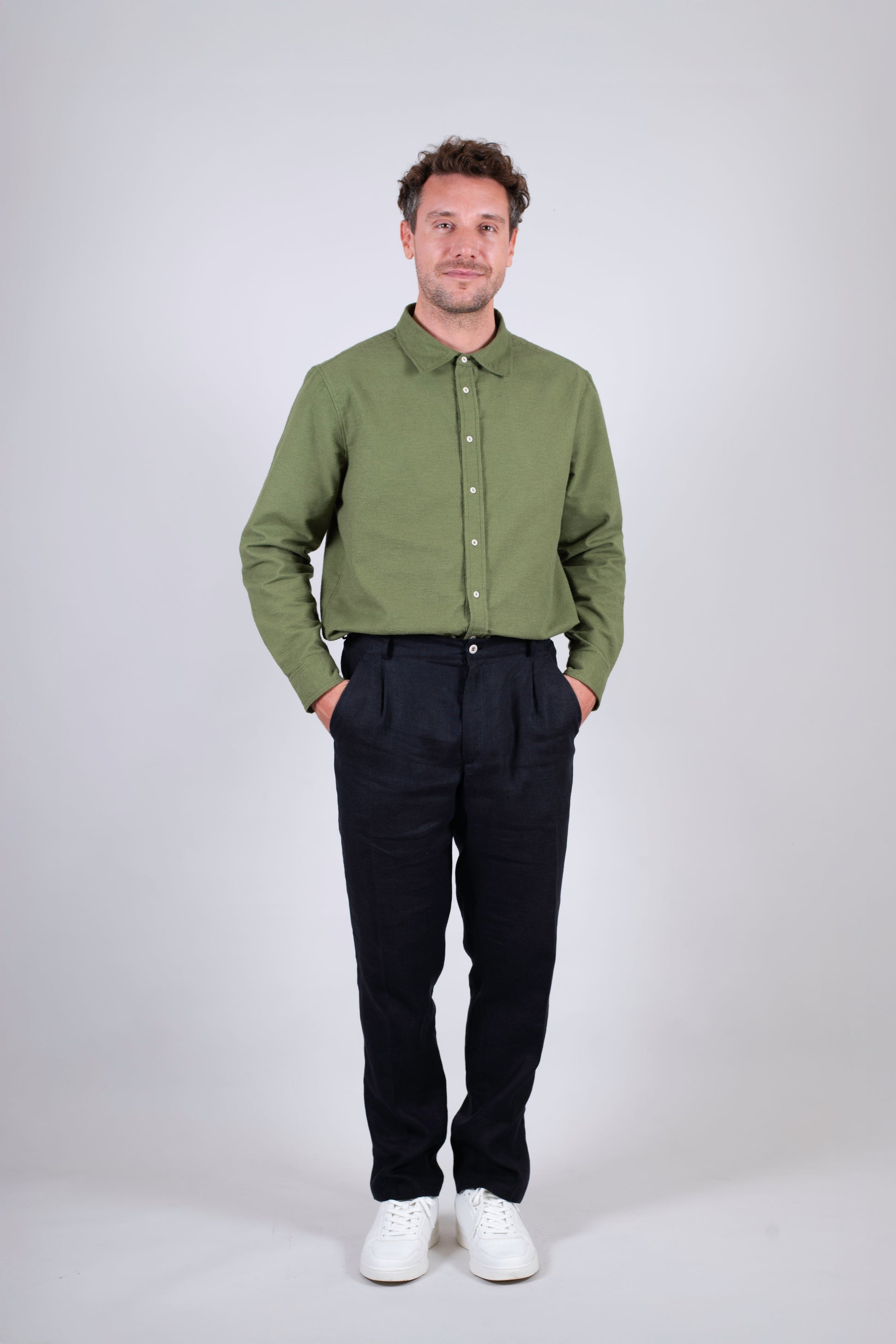 Męskie spodnie z luźnym krojem loose-fit wykonane w 100% z lnu, zmiękczonego specjalną obróbką, są niezwykle przyjemne dla ciała. Gumka wszyta z tyłu w pasie zapewnia komfort bez ucisku, przód to klasyczne zapięcie na guzik i zamek. Spodnie mają szlufki na pasek, co pozwala na stworzenie bardziej eleganckiego wyglądu. Starannie i odpowiedzialnie uszyte w Czechach. Tkanina o średniej gramaturze staje się jeszcze delikatniejsza po praniu.