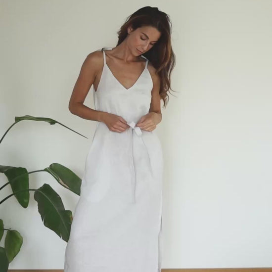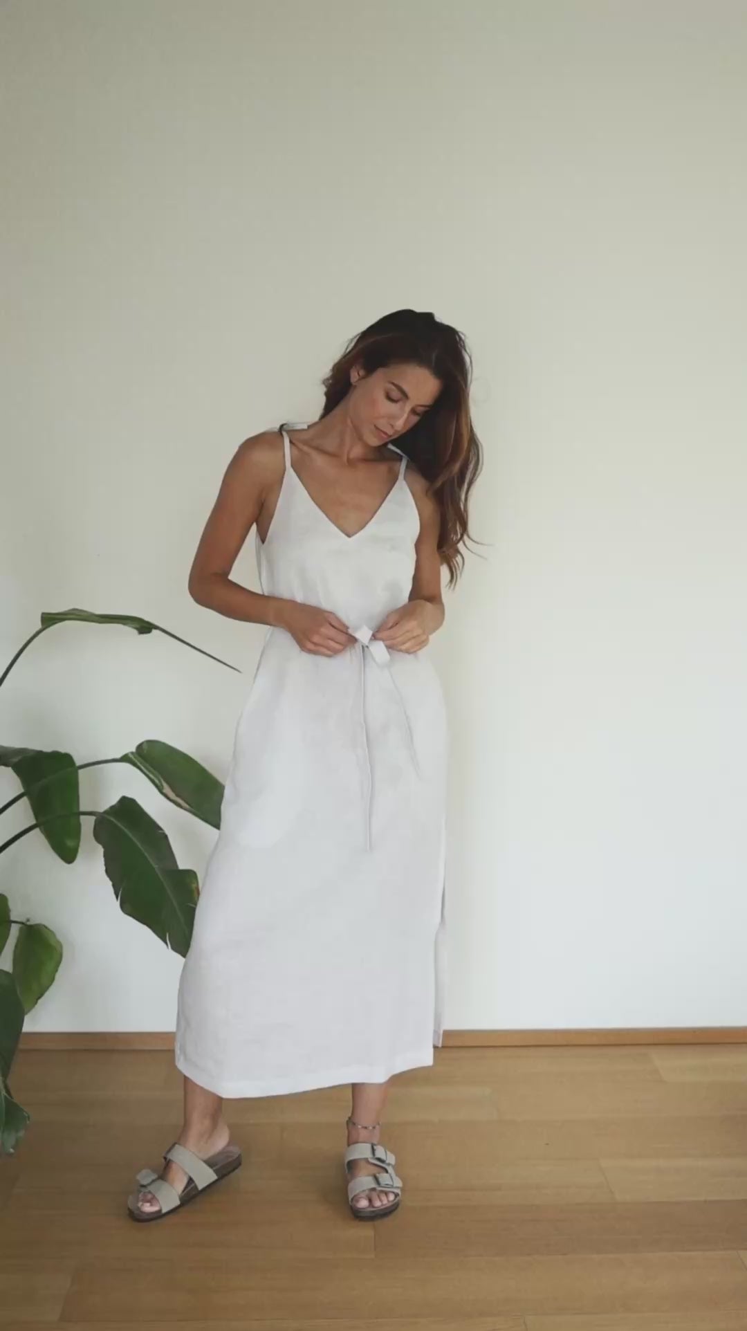 Ta lniana sukienka damska z regulowanymi ramiączkami, bocznym rozcięciem, kieszeniami i wiązanym paskiem łączy lekkość z elegancją. Luźny krój (loose fit) zapewnia wygodę, a pasek pozwala dopasować sukienkę do sylwetki – można go zawiązać z przodu, z tyłu lub z boku.