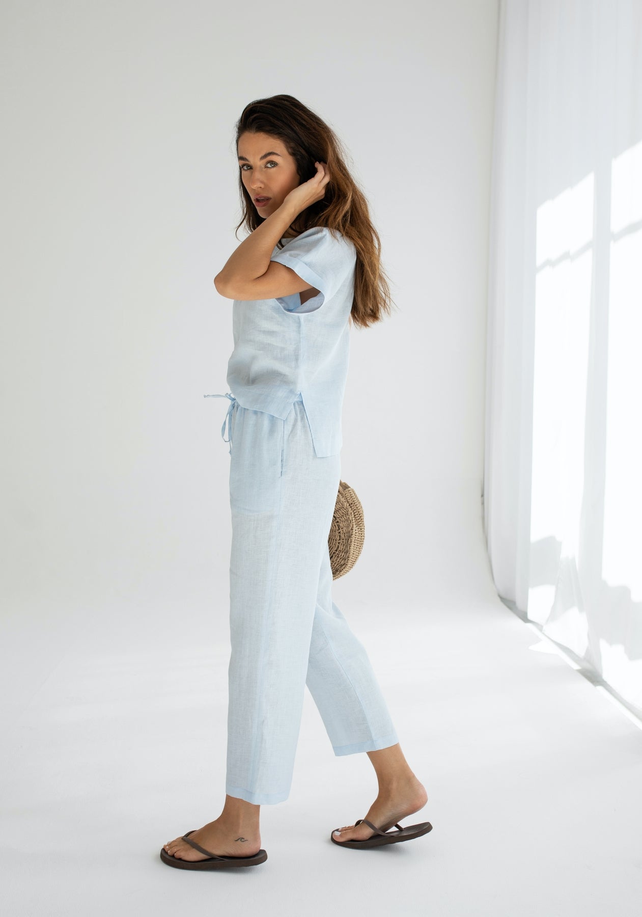 Lniany top damski z dłuższym tyłem. Niesamowicie przyjemne dla ciała dzięki zmiękczającemu wykończeniu materiału. Rozmiar jest dość duży - luźny krój. Wyprodukowano precyzyjnie i w sposób zrównoważony w UE.