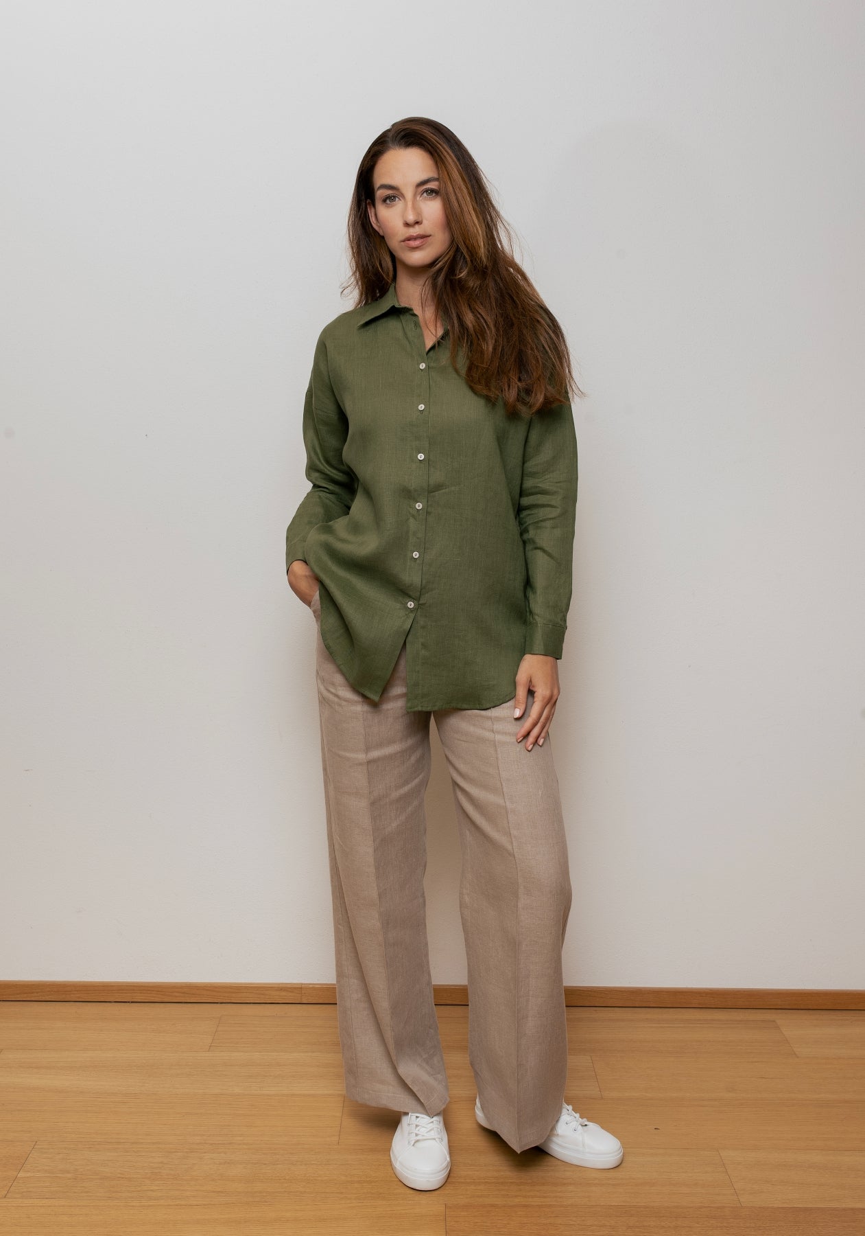 Dámska ľanová košeľa s golierom loose fit - Moss green
