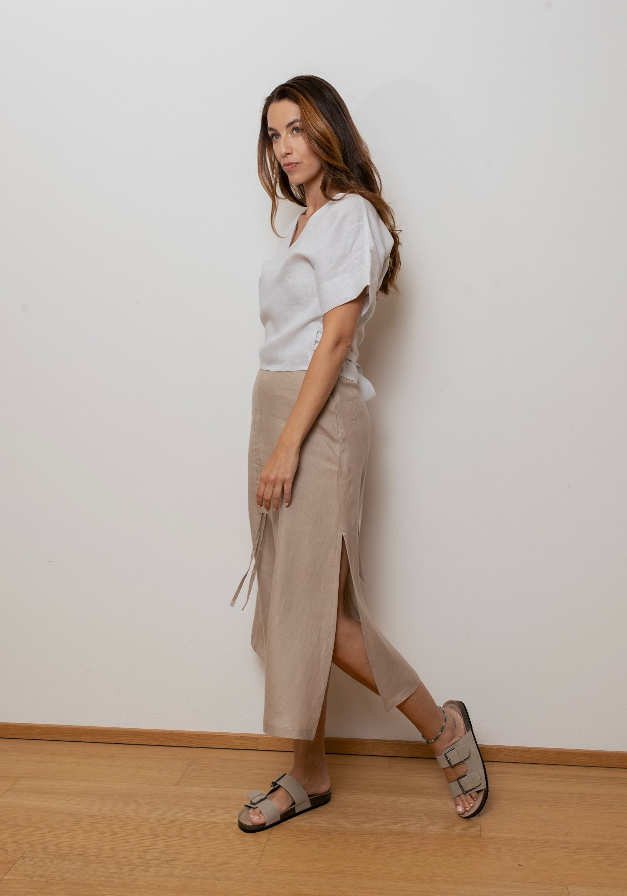 Náš tip na kombinovanie: Vďaka neutrálnemu odtieňu ľahko skombinujete sukňu s ľanovými topmi v akejkoľvek farbe alebo s bavlneným tričkom pre ležérnejší vzhľad.