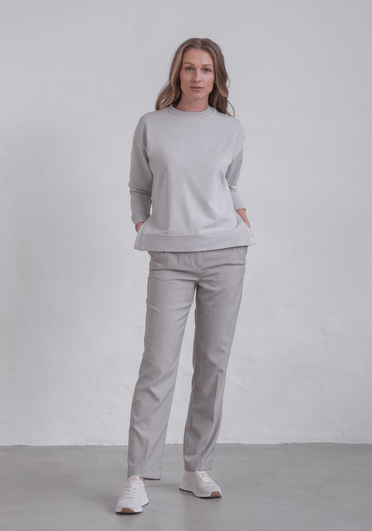 Pohodlná a štýlová dámska mikina s jemným nápletom okolo krku a bočnými rozparkami. Vyrobená z 95 % nečesanej biobavlny a 5 % elastanu – výnimočne mäkká, priedušná a príjemná na dotyk. Skrátený predný diel opticky predlžuje postavu a poskytuje pohodlie počas celého roka.