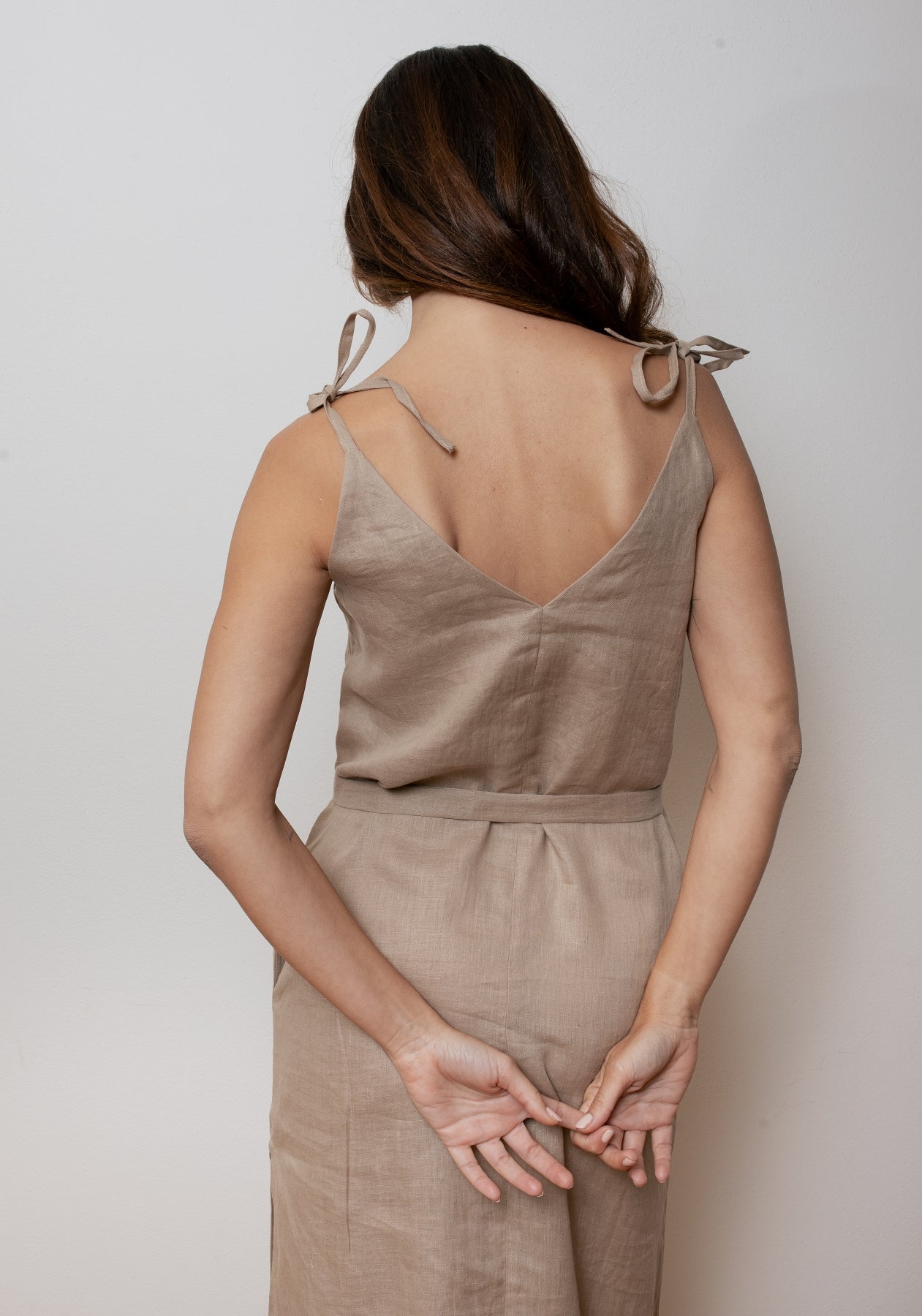 Dámske ľanové šaty s nastaviteľnými ramienkami, vreckami a bočným rozparkom dopĺňa viazací opasok, vďaka ktorému si šaty prispôsobíš svojej postave. Voľnejší strih (loose fit) poskytuje maximálne pohodlie a možnosť rôznych spôsobov uväzovania – vpredu, vzadu alebo na boku.