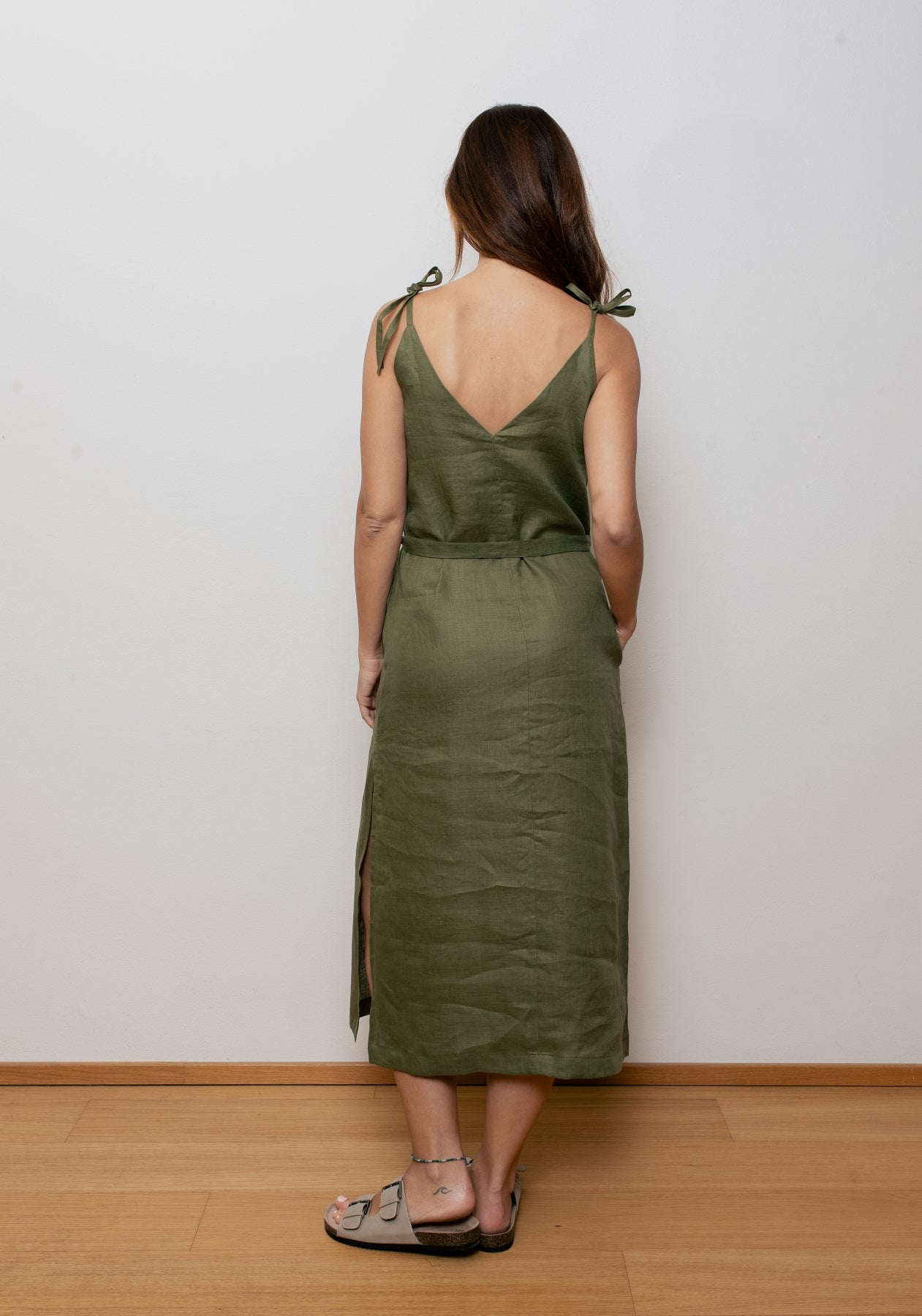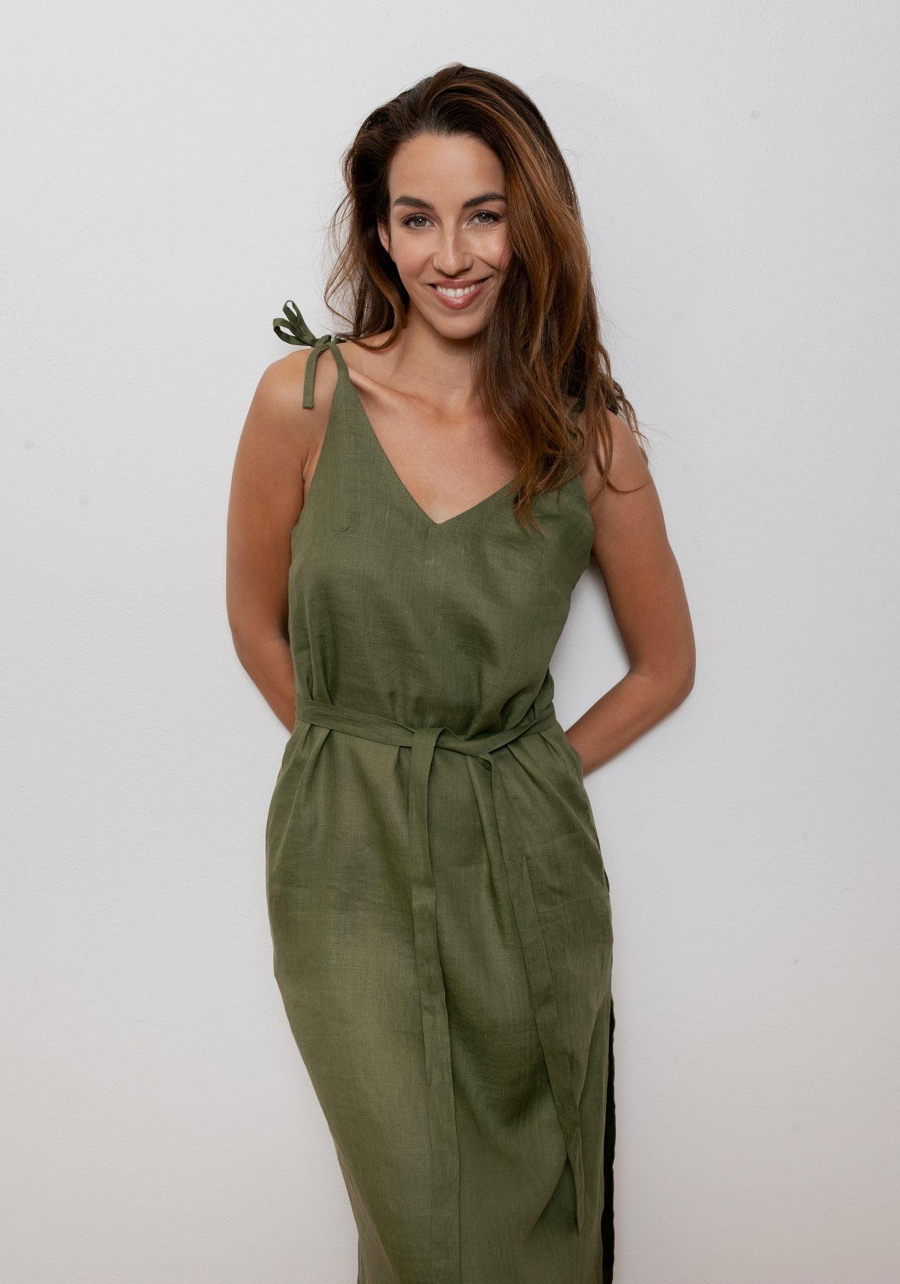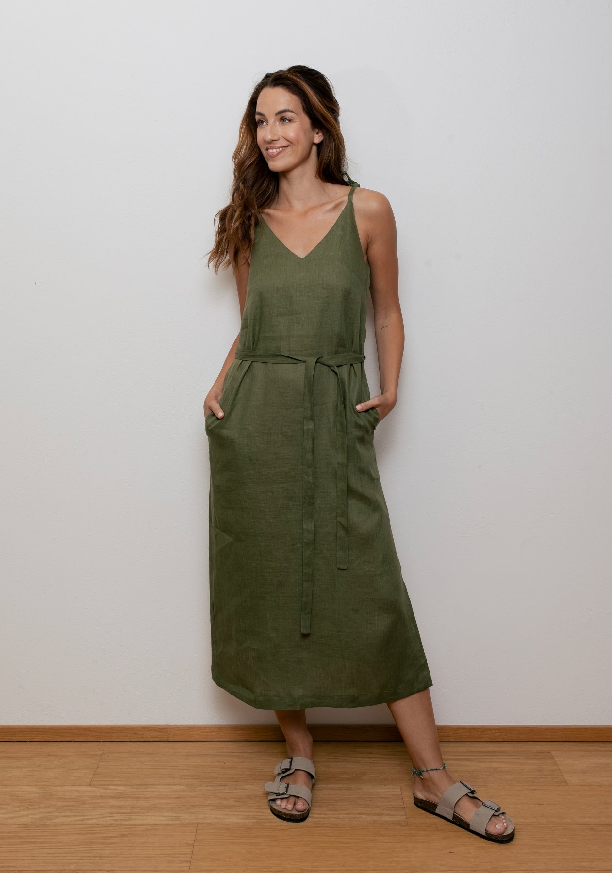 Dámske ľanové šaty s nastaviteľnými ramienkami, vreckami a bočným rozparkom dopĺňa viazací opasok, vďaka ktorému si šaty prispôsobíš svojej postave. Voľnejší strih (loose fit) poskytuje maximálne pohodlie a možnosť rôznych spôsobov uväzovania – vpredu, vzadu alebo na boku.