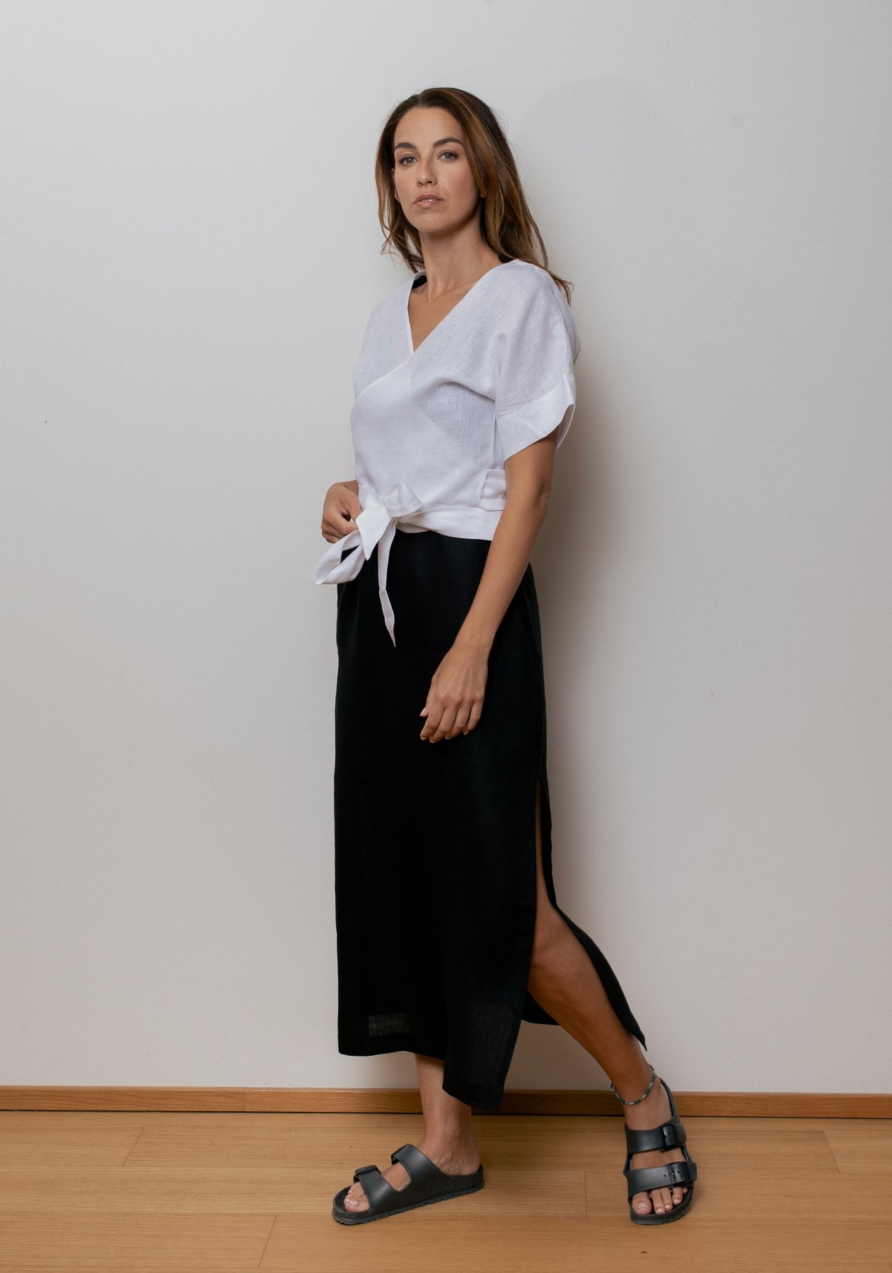 Tento ľanový zavinovací top je vyrobený zo 100 % prírodného ľanu so zmäkčujúcou úpravou, vďaka čomu je mimoriadne príjemný na dotyk a pohodlný na nosenie. Variabilné zaväzovanie umožňuje prispôsobenie veľkosti – pohodlne sedí na dve konfekčné veľkosti. Nosiť ho môžete samostatne k nohaviciam, šortkám alebo sukni – ak si zvolíte sukňu v rovnakom odtieni, pôsobí ako šaty. Rovnako dobre sa nosí ako štýlový doplnok na tričko, top alebo šaty.