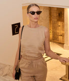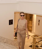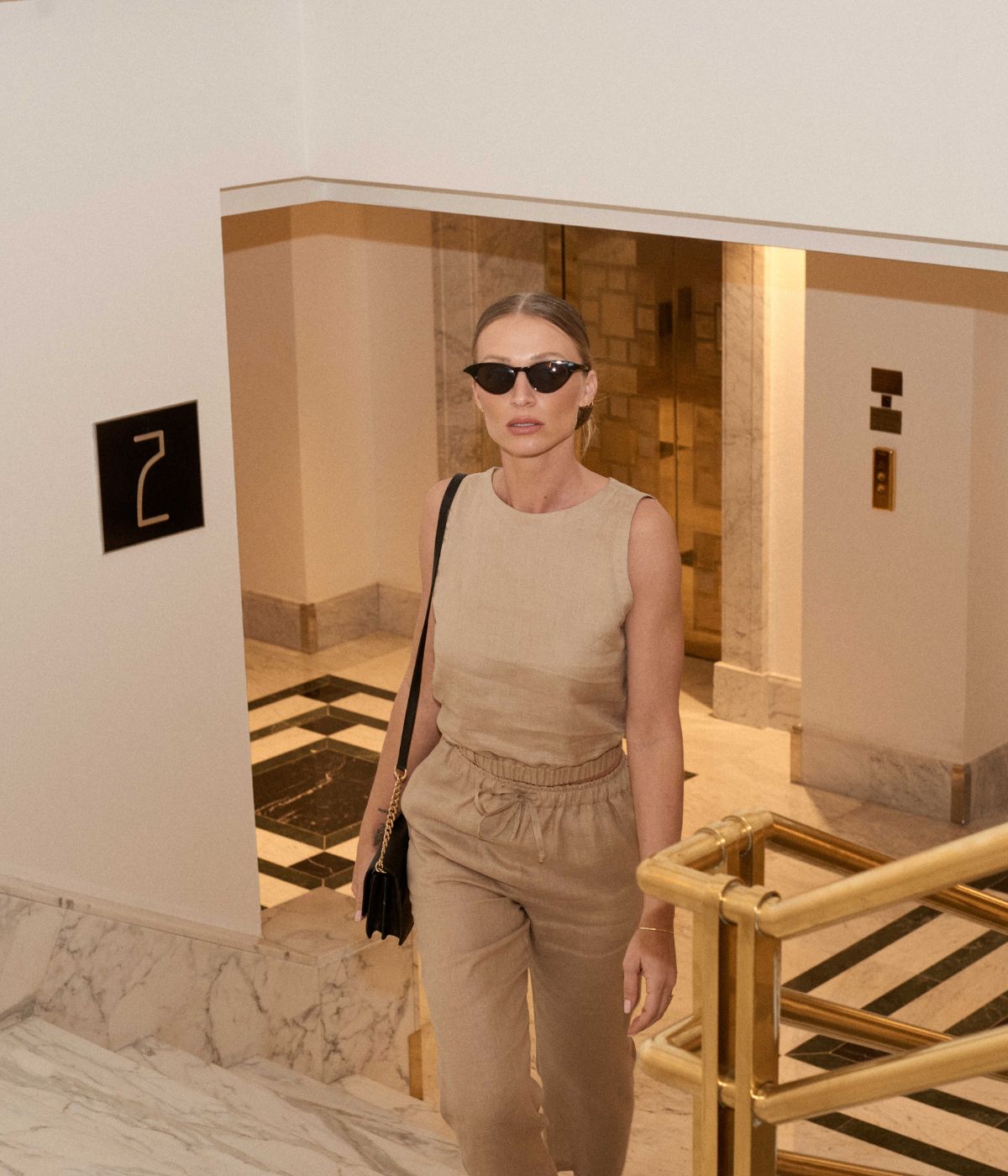 Dôkaz, že aj jednoduchý jednofarebný look dokáže byť neskutočne šik a elegantný. Ľanové oblečenie sa skvele kombinuje a vrství, v tomto outfite sa jedná o ľanový crop top a 7/8 voľné ľanové nohavice.